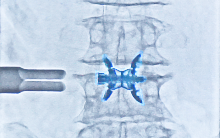 専用の器具を通して、スペーサーを挿入し、狭くなった脊柱管を広げます。棘突起間にスペーサーが入ったら、羽根を開けて棘突起間に固定します。